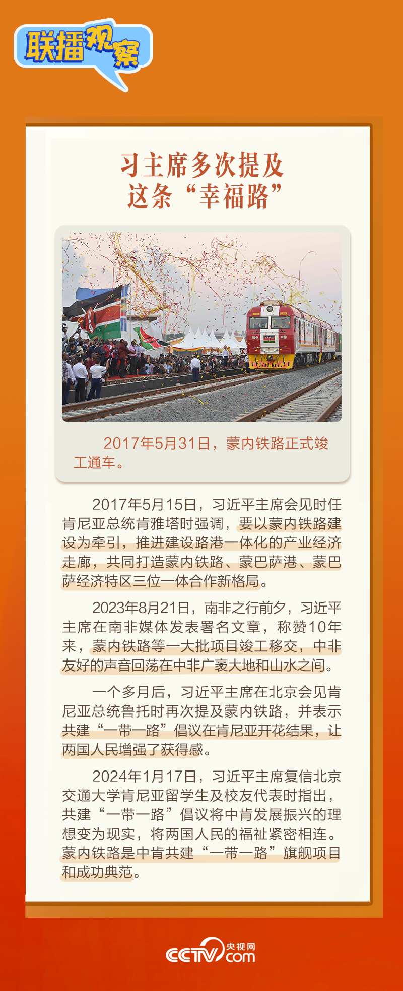 | 联播+日前,北京交通大学肯尼亚留学生及校友代表致信习近平主席,表示非常高兴来到中国学习铁路运营管理知识。1月17日,习近平主席复信表达欣慰和喜悦之情,“蒙内铁路是中肯共建‘一带一路’旗舰项目和成功典范。我高兴地看到,你们因这条‘幸福路’与中国结缘……” 此前,习主席在外事活动中多次提及蒙内铁路,《新闻联播》也持续关注这条路的建设及开通后的运营情况。这条“幸福路”有何特别之处,习主席为何频频提及?它的建成通车给当地带来哪些变化?《联播观察》邀您一同了解。